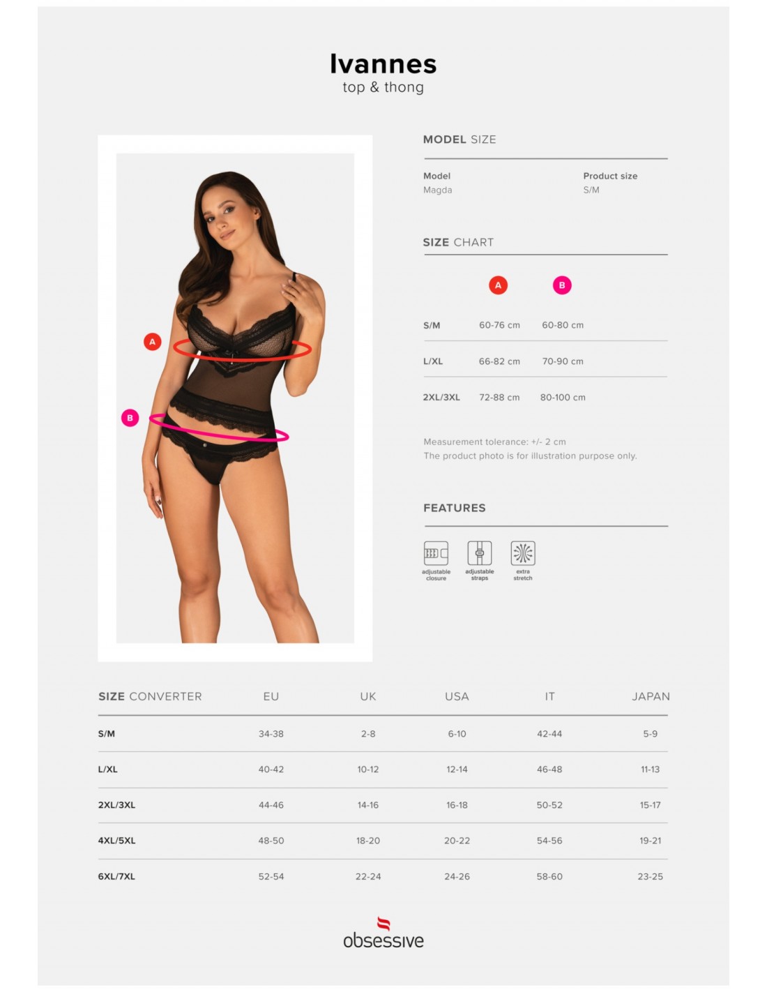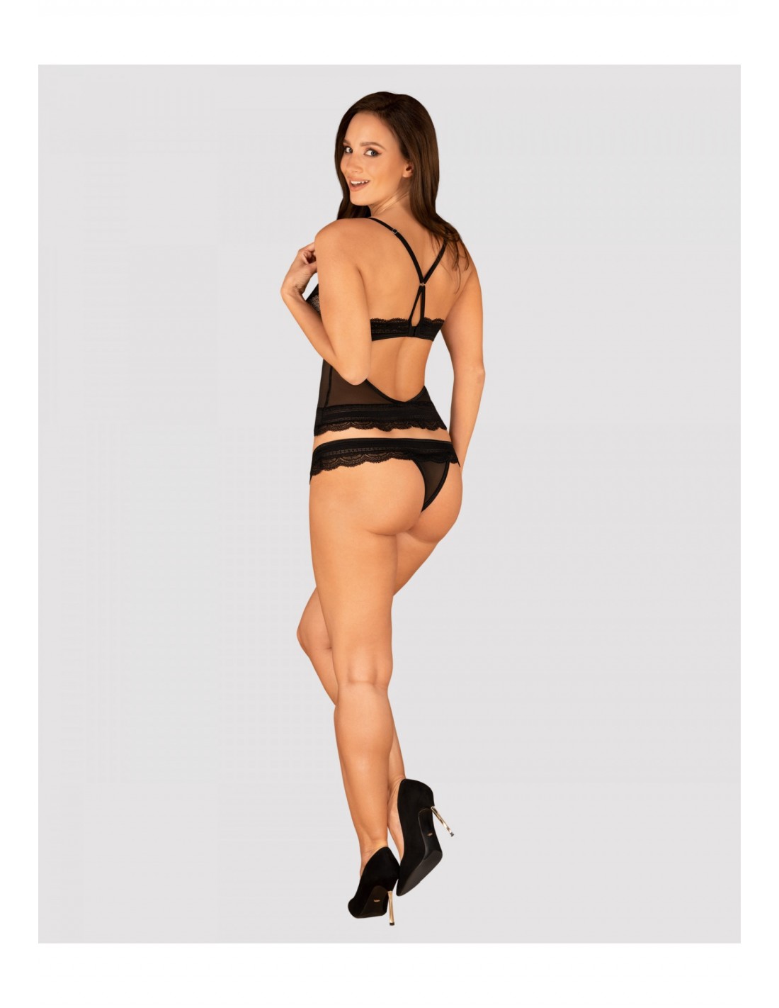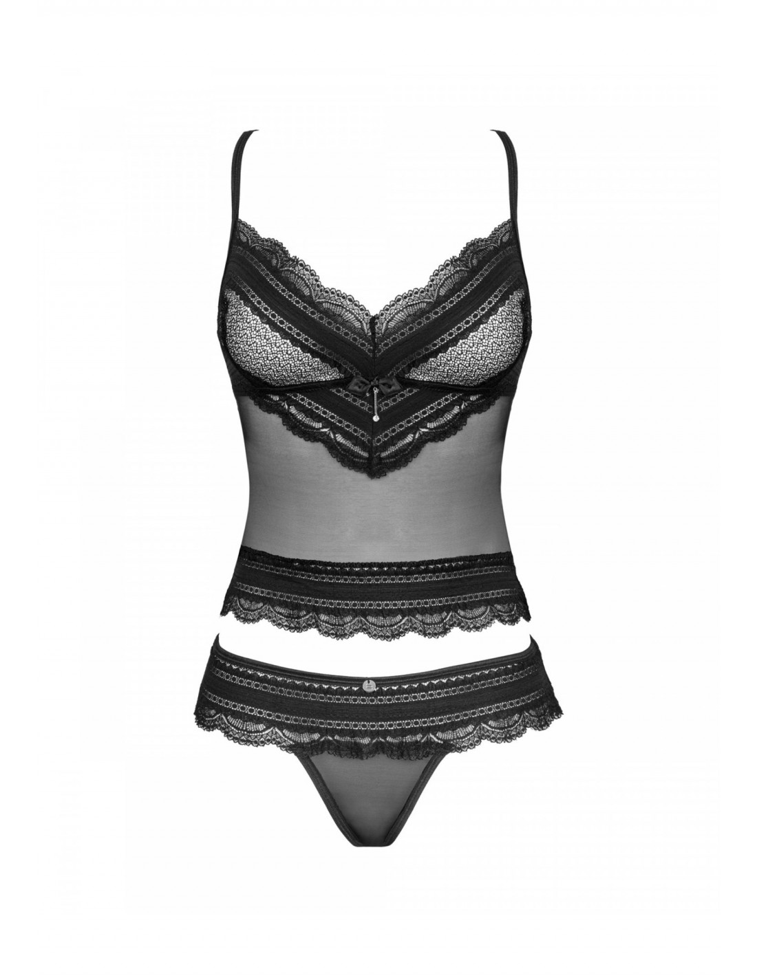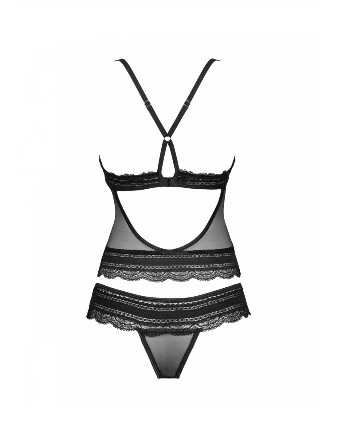 Poznaj uroczy top i stringi z kolekcji Ivannes. Ta propozycja kusi kobiecym fasonem i intryguje niezwykle seksownym, koronkowym wykończeniem. Głęboki dekolt fantastycznie podkreśla wygląd biustu, a odsłonięte plecy są zachętą do spędzenia rozkosznych chwil w sypialni. Spójrz tylko na te pełne seksapilu majteczki i wyobraź sobie, jak fantastycznie podkreślą Twoje nogi i pośladki! Czy można chcieć więcej? 😉Poznaj więcej szczegółów:- czarny top i stringi Ivannes- elegancka koronka – pięknie zdobi ciało- odsłonięte plecy – fenomenalny wygląd z efektem wow- regulowane zapięcie na tyle- regulowane ramiączka krzyżujące się na plecach – perfekcyjne dopasowanie do ciała - stringi zdobione biżuteryjną zawieszką – fantastyczny wygląd nóg i pośladków- lekko prześwitujące materiały – rozpalają zmysły- przyjemny i elastyczny materiał (85% poliamid, 15% elastan)
