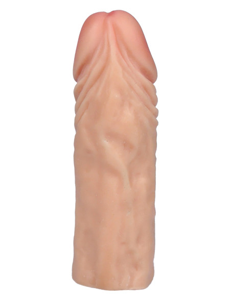 Realistycznie wyprofilowana nakładka w kolorze cielistym. Wykonana została z wysokiej jakości cyberskóry. Super rozciągliwa, idealnie przylegająca. Pasuje do większości rodzajów członka lub wibratora. Materiał ten podobnie jak prawdziwa ludzka skóra szybko się nagrzewa, dostosowując to temperatury ciała. Gwarantuje to doznania na najwyższym poziomie, zbliżone do realistycznych.Z tą nakładka bez problemu wydłużysz i pogrubisz swojego penisa, dzięki czemu Ty i Twoja partnerka będziecie czerpać jeszcze większą satysfakcję z seksu. Naturalny kształt został wyprofilowany z uwzględnieniem wszystkich anatomicznych detali.Długość całkowita: 17,5 cm.Pogrubia o 1,3 cm.